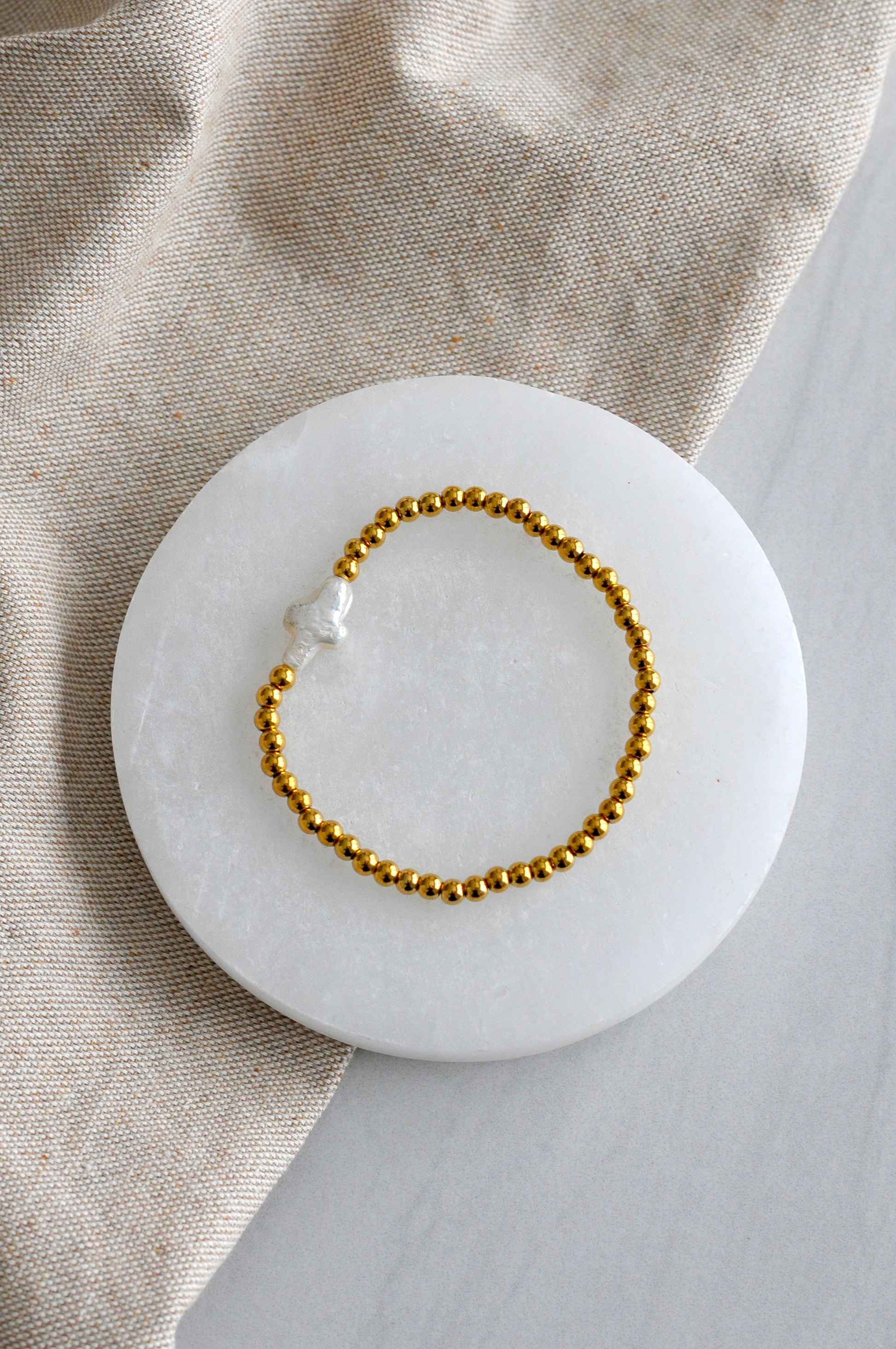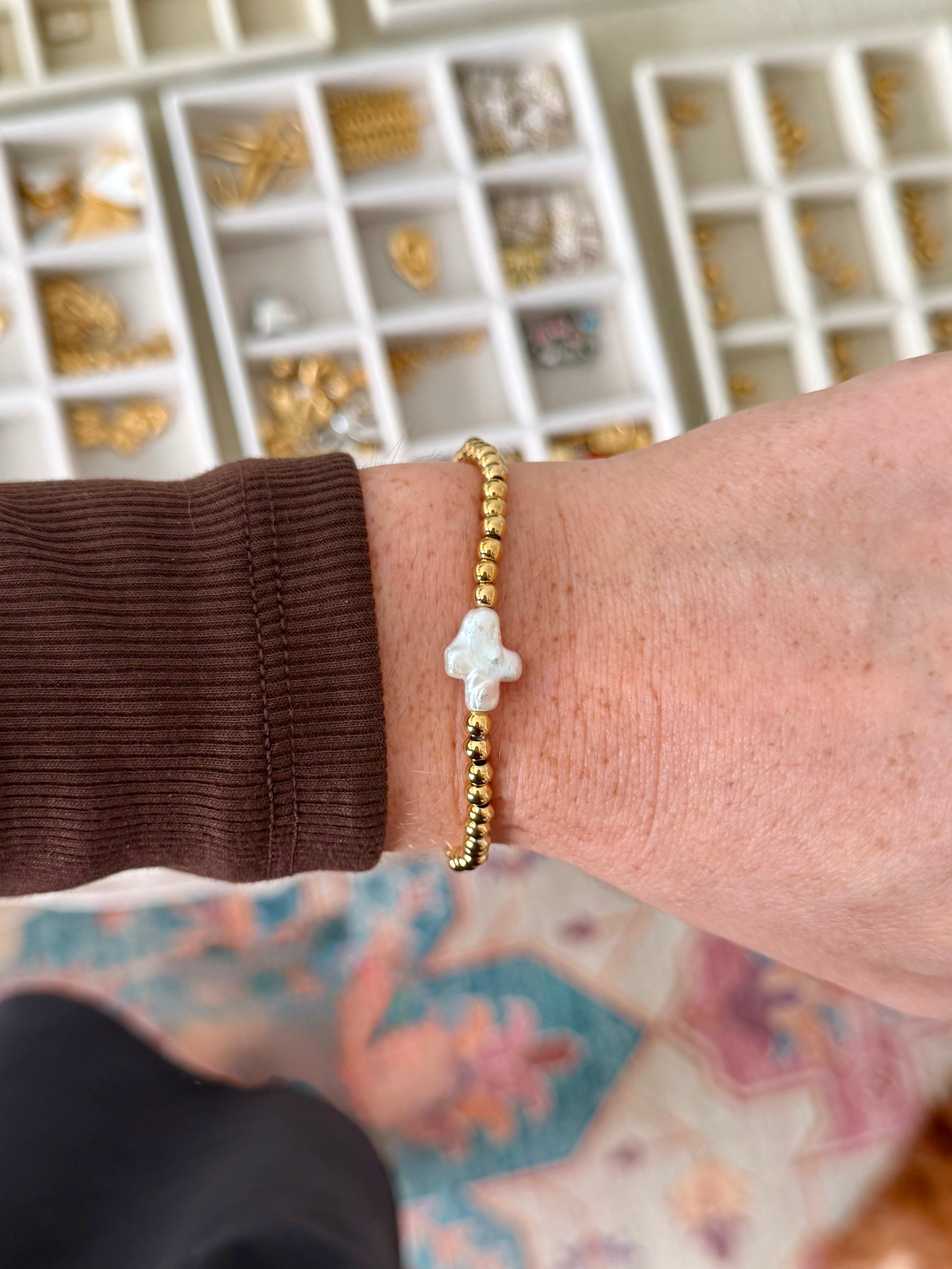 - Waterproof 18K beaded bracelet with pearl cross